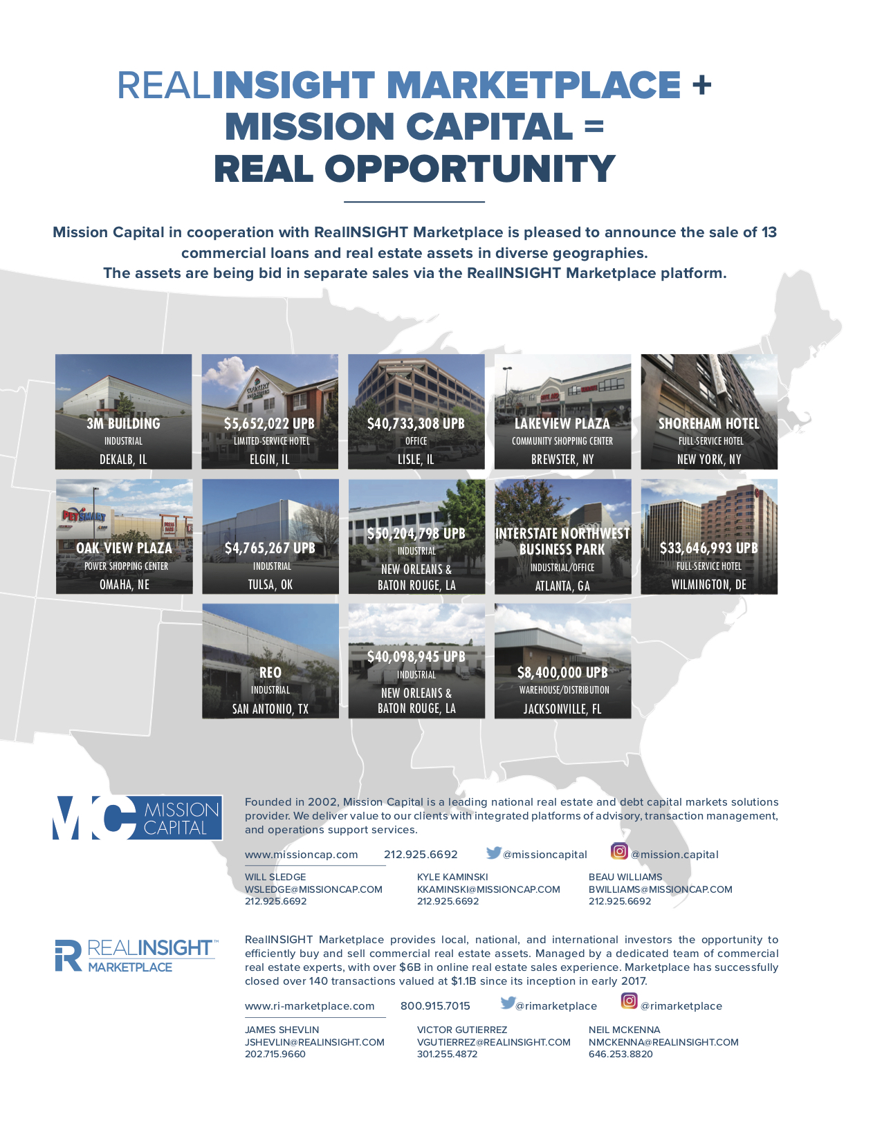 Mission Capital in cooperation with RealINSIGHT Marketplace is please to announce the sale of 13 commercial loans and real estate assets in diverse geographies.
