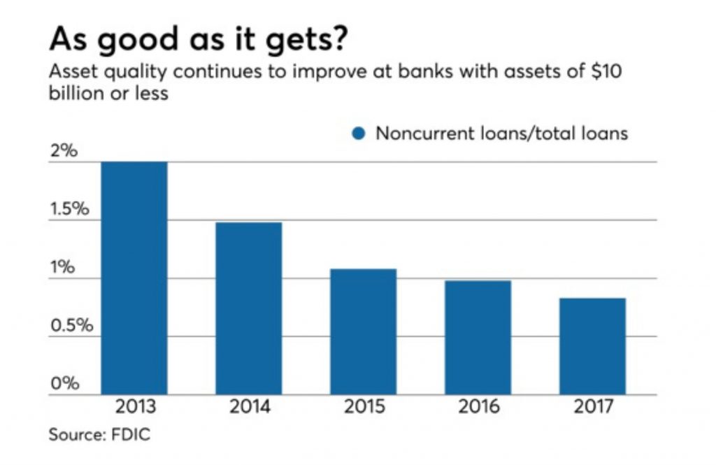Credit quality has improved significantly since the depths of the recession. Problem assets for all banks totaled $193 billion at Dec. 31, according to data from the Federal Deposit Insurance Corp. That figure included other real estate owned, assets that were 30 to 89 days past due and at least 90 days late, and those in nonaccrual status.