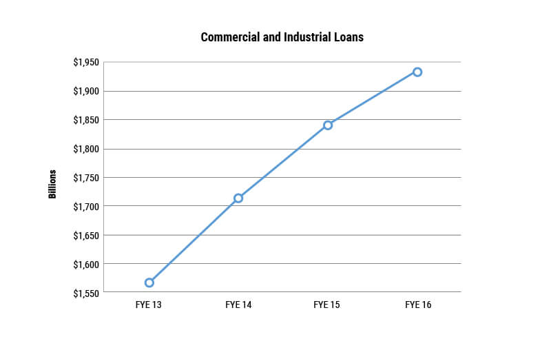 Per the FDIC, C&I lending has grown over the past several years, reaching an apex of $1.936 trillion dollars as of year-end 2016.
