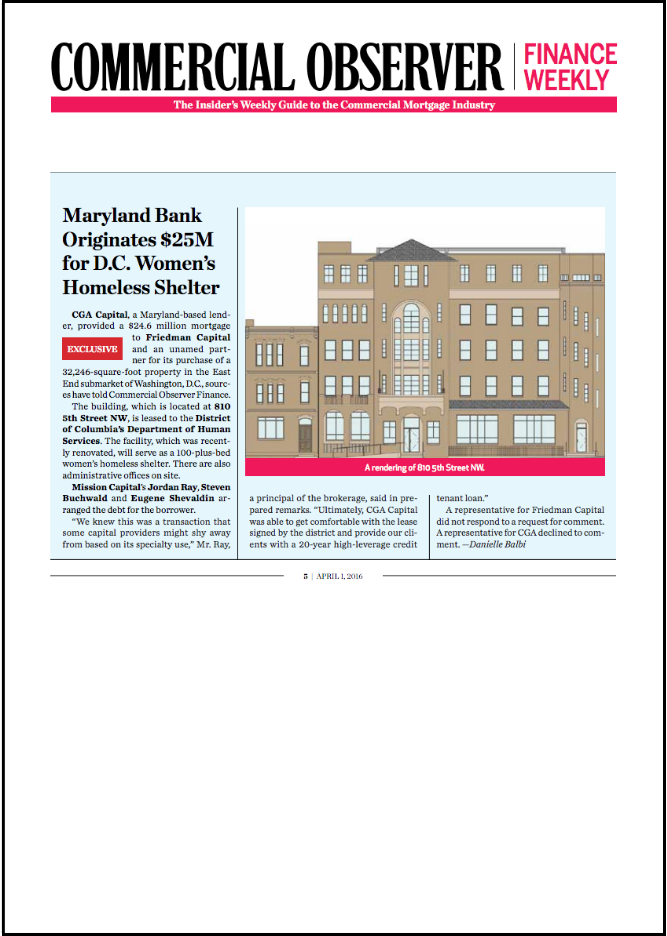 CGA Capital provided Friedman Capital a $24.6 million mortgage for a property in the East End of Washington DC. Mission Capital arranged the debt for the borrower.