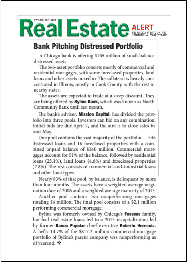 A Chicago bank is offering $166 million of small-balance distressed assets. The bank’s advisor, Mission Capital, has divided the portfolio into three pools. Investors can bid on any combination, and initial bids are due April 7.