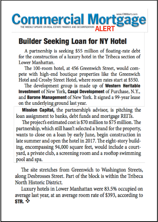 A partnership is seeking $55 million of floating-rate debt for the construction of a luxury hotel in the Tribeca section of Lower Manhattan. Mission Capital, the partnerships’s advisor, is pitching the loan assignment to banks, debt funds and mortgage REITs.